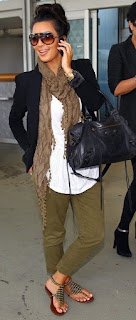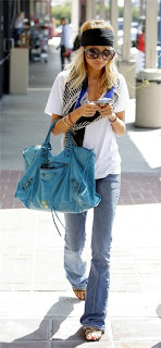White v-neck tee, jeans, graphic scarf, & big colorful bag.